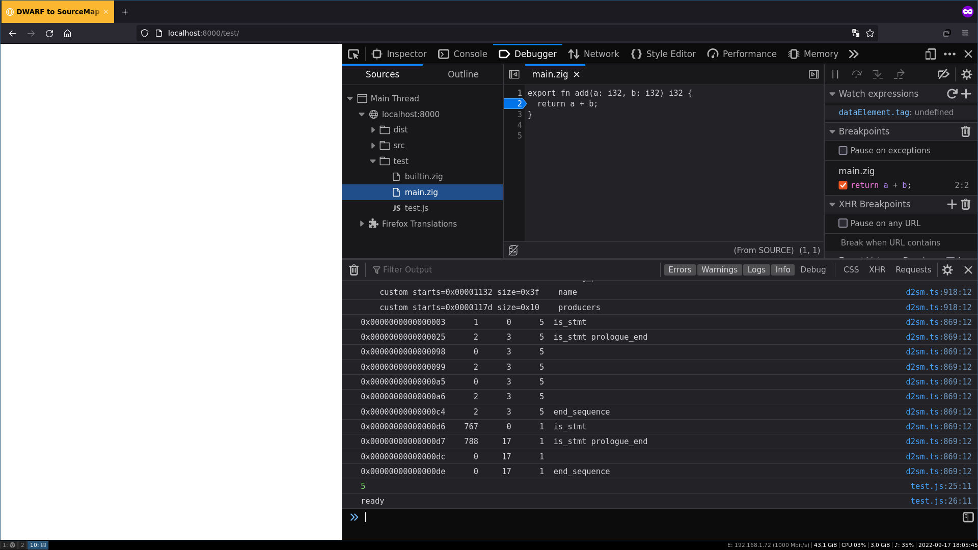 You will find here a pretty good introduction to source maps so you can get detailed knowledge of their format.The idea we are going to follow here is not mine but comes from the emscripten team which had the idea of converting DWARF line number programs to source maps. They wrote a little python script which parses the output of dwarfdump and generate a source map file. It's pretty neat and works well, however what we are doing is a little different. Instead of parsing the output of dwarfdump we are reading the DWARF symbol directly (what we've been doing for the last 3 articles!) and then, instead of generating a file that must be served separately we will embed the source maps directly in the WASM file. We will be able to do that on the fly, in the browser, instead of relying on a separate development process where the source map must be generated and hosted on the backend. All in all it is just simpler for the user and allow you to even debug WASM that comes from some third party sources, as long as it contains the DWARF symbol.